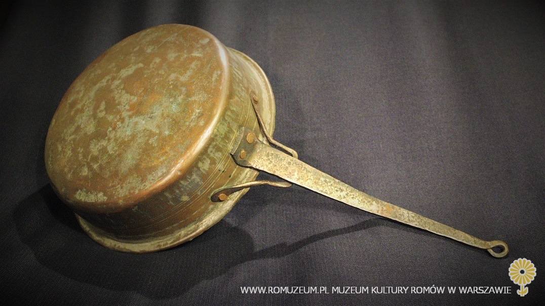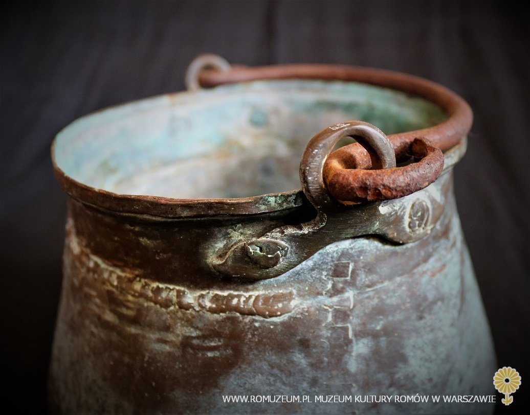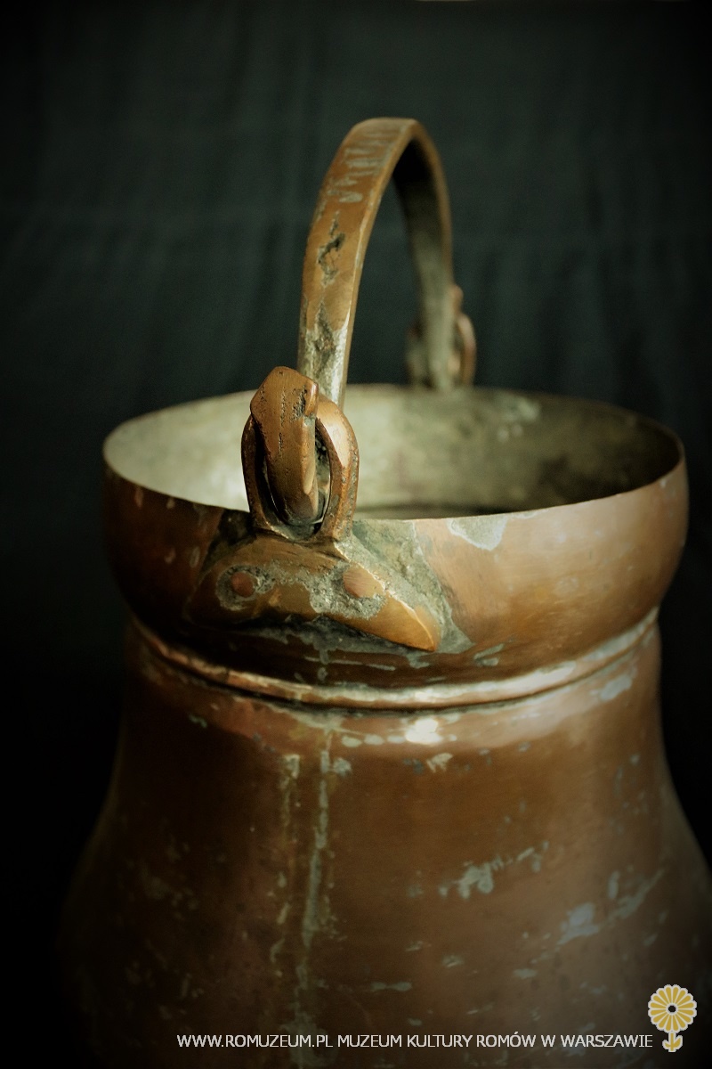 kociołek z blachy miedzianej, bielony cyną, blacha łączona w rulon metodą tzw. "cygańskiej drogi", kołnierz naprawiany lub łączony metodą lutowania, pałąk z drutu żelaznego, średnica 22 cm, wysokość 16 cm, Polska, początek XX w.
