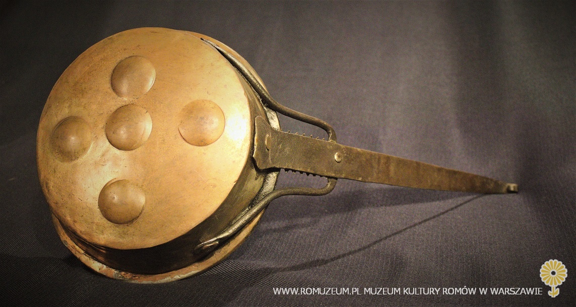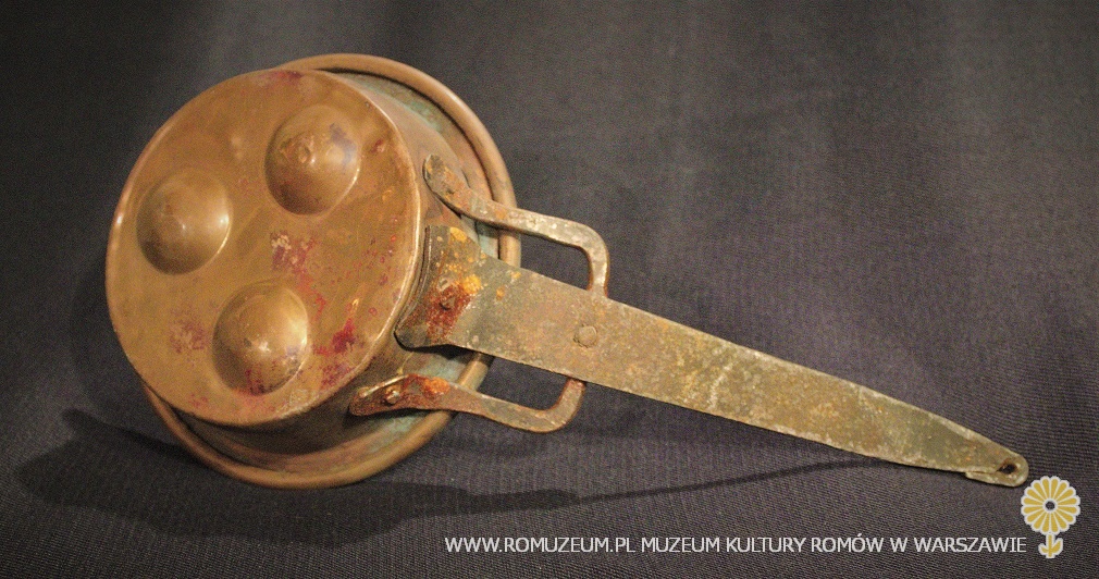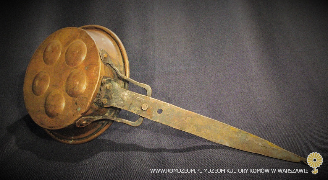 patelnia "pięciojajeczna" z blachy miedzianej, bielona cyną, uchwyt nitowany z żelaza, element zdobniczy z miedzi, średnica 20 cm, wysokość 6 cm, uchwyt 43 cm, Bałkany, przełom XIX i XX w.