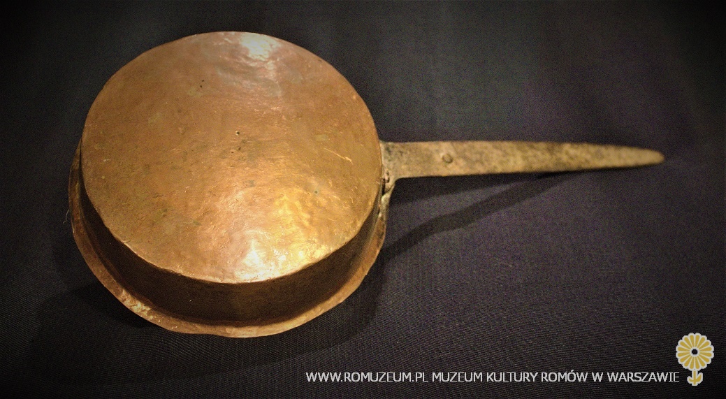 patelnia z blachy miedzianej, bielona cyną, uchwyt nitowany z żelaza, średnica 28 cm, wysokość 8 cm, uchwyt 52 cm, Bałkany, przełom XIX i XX w.