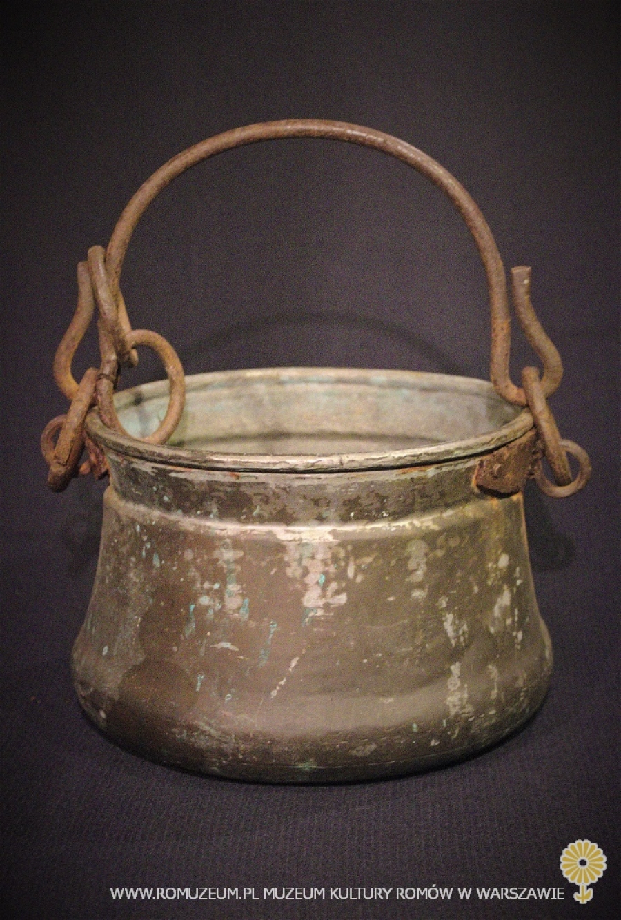 kociołek z blachy miedzianej, bielony cyną, blacha łączona metodą lutowania, pałąk z drutu żelaznego, średnica 27 cm, wysokość 18 cm, Bałkany, przełom XIX i XX w.
