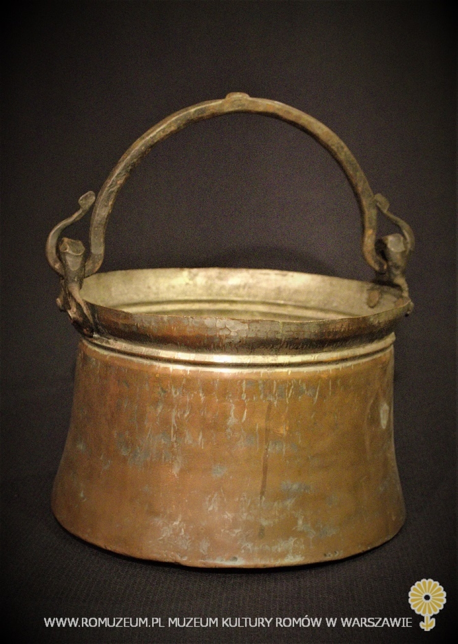 kociołek z blachy miedzianej, bielony cyną, blacha łączona metodą lutowania, pałąk kuty - żelazny, średnica 28 cm, wysokość 18 cm, Bałkany, przełom XIX i XX w.