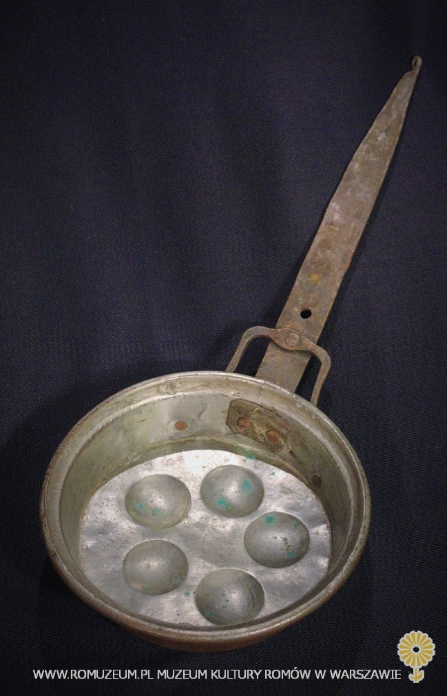 patelnia "pięciojajeczna" z blachy miedzianej, bielona cyną, uchwyt nitowany z żelaza, średnica 20 cm, wysokość 6 cm, uchwyt 48 cm, Bałkany, przełom XIX i XX w.