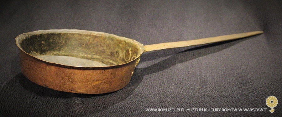 patelnia z blachy miedzianej, bielona cyną, uchwyt nitowany z żelaza, średnica 20 cm, wysokość 5 cm, uchwyt 46 cm, Europa środkowa, przełom XIX i XX w.