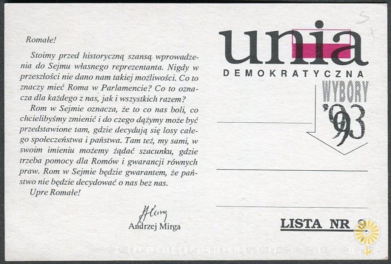 Andrzej Mirga, romski kandydat do Sejmu RP z Listy Unii Wolności, Wybory 1993 r. - Lista nr 9. Druk ulotny w formie karty pocztowej, 1993