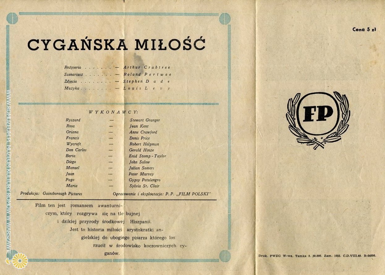 Cygańska Miłość [Caravan], produkcja - Gainsborough Pictures, reż. Arthur Crabtree, w rolach głównych: Stewart Granger, Jean Kent, Anne Crawford, Wielka Brytania - premiera 1946. folder reklamowy-zaproszenie, FILM POLSKI, wydawca PWZG Tamka 3, papier i druk rotograwiurowy, 10 x 21,5 cm, 1948