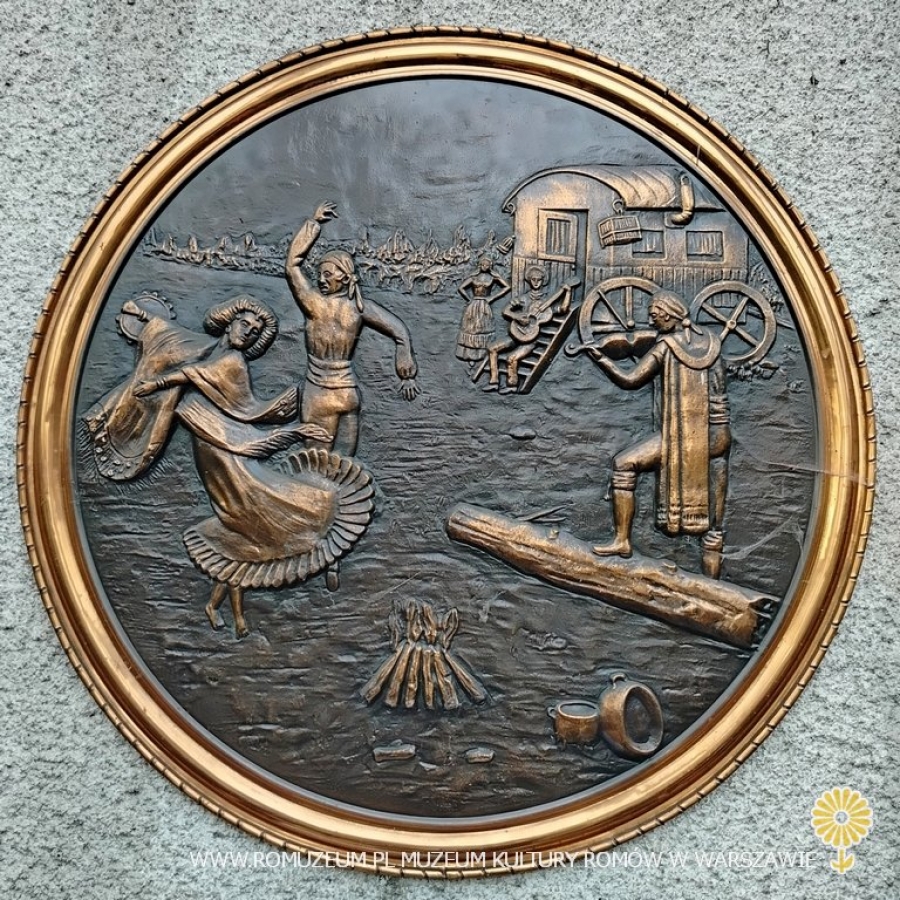 W taborze, taniec przy ognisku, miedziana plakieta, autor i produkcja nieznana (prawdopodobnie kraje Benelux lub Niemcy), D=65 cm., circa 1970