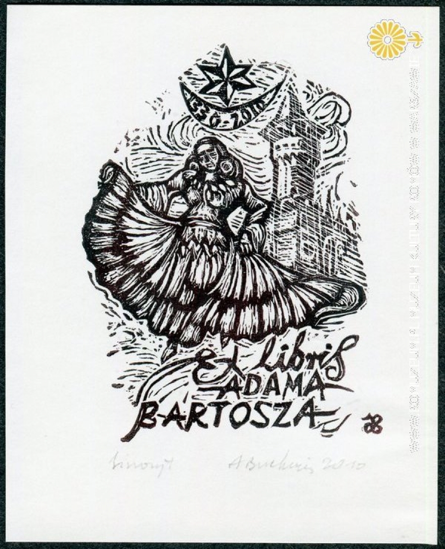 Exlibris Adama Bartosza (*22 I 1947 Zielona Góra), aut. Andrzej Buchaniec (*30 III 1944 Lwów - †12 VI 2021), linoryt odręcznie sygnowany, 10,3 x 8,3 cm., 2010