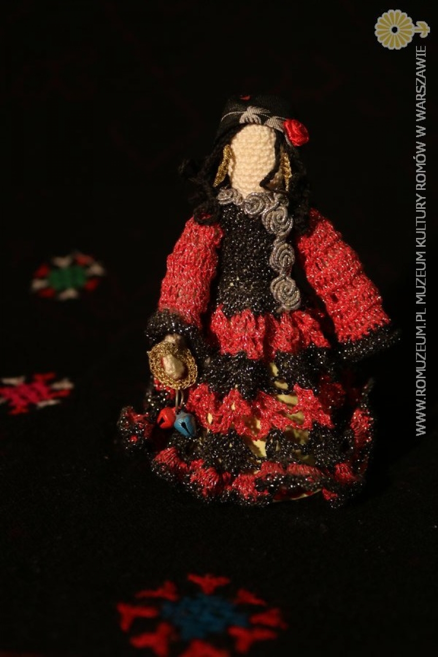 Lalka obszyta szydełkiem na tekturowej formie, 11x12 cm. Wyrób unikalny zakupiony w Polsce od autorki (nazwisko nieznane)