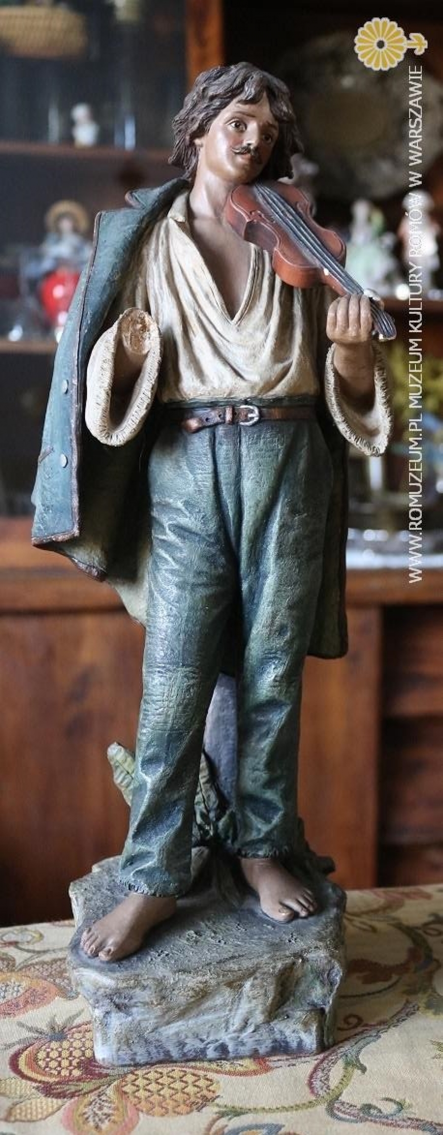 Skrzypek, manufaktura Arno Fischer, znak towarowy "Deponirt", uszkodzenia (brak prawego przedramienia ze smyczkiem i kciuka lewej ręki), 43x14 cm., Niemcy circa 1900
