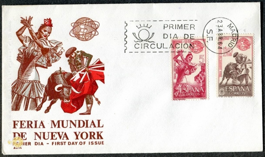 Flamenco, Taniec hiszpański, Wystawa Światowa w Nowym Jorku, Baile Español, Feria Mundial de Nueva York 1964-1965, okolicznościowa koperta oklejona znaczkami pocztowymi, stempel, obieg 23 IV 1964