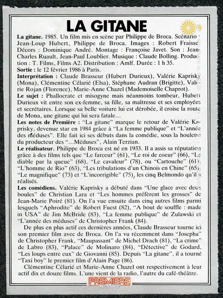 "La Gitane" w rolach głównych Claude Brasseur i Valérie Kaprisky, folder reklamowy (13 x 9,5 cm) francuskiej komedii, reż. Philippe de Broca, zdjęcia Robert Fraisse, premiera 1986