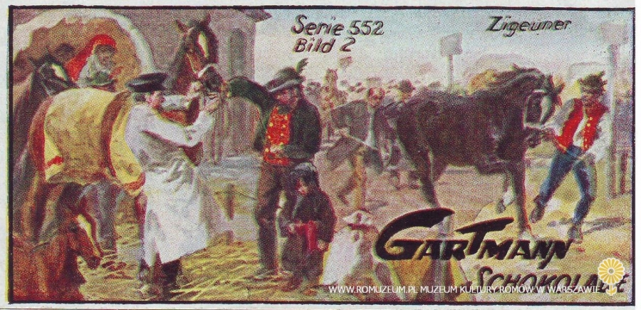 Handel końmi - Życie Cyganów, Zigeunerleben - Serie 552, bild [karta] 2/6, reklamowa karta kolekcjonerska dodawana do produktów cukierniczych Kakao und Schokolade Fabrik, wydawca: C.H.L.Gartmann, Altona, circa 1900