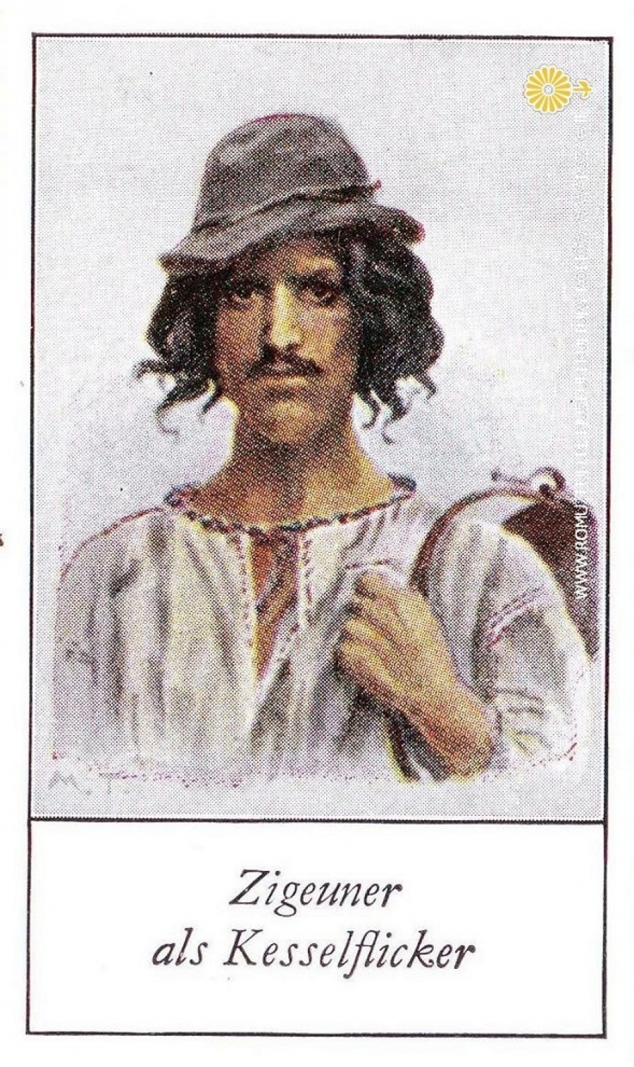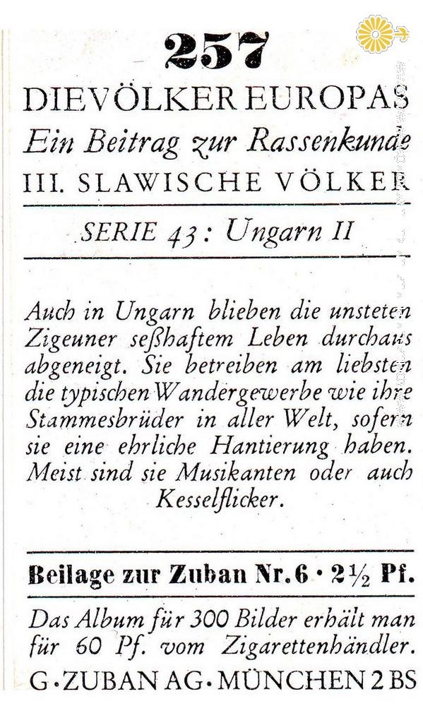 Cygan-kotlarz (Kełderasze). Zigeuner als Kesselflicker. Die Völker Europas. Ein Beitrag zur Rassenkunde III. Slawische Volker, Serie 43- Ungarn II. nr257. G. Zubanag. München 2 BS., karta kolekcjonerska dodawana do produktów tytoniowych, circa 1930