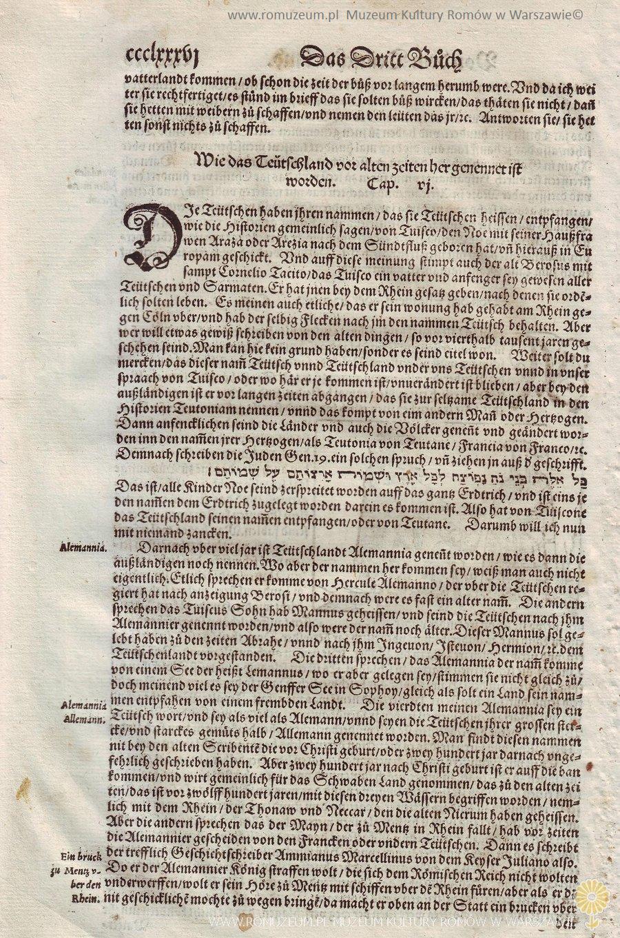 Cyganie, pojedyncza, dwustronnie zadrukowana w języku niemieckim karta z drzeworytem na papierze czerpanym pochodzi z "Cosmographi" Sebastiana Münstera. Edycja niemiecka wydana w Bazylei w 1574 r.