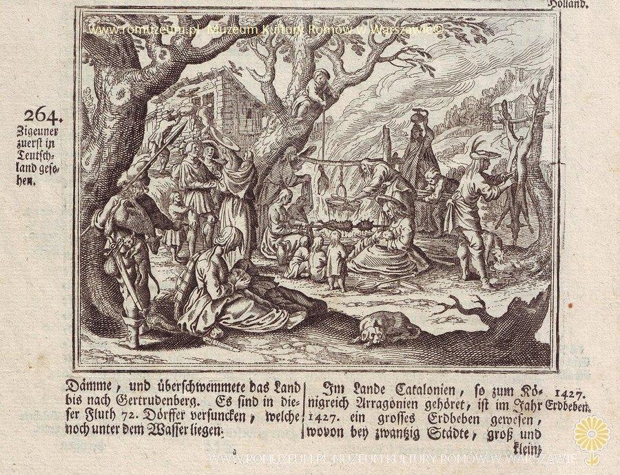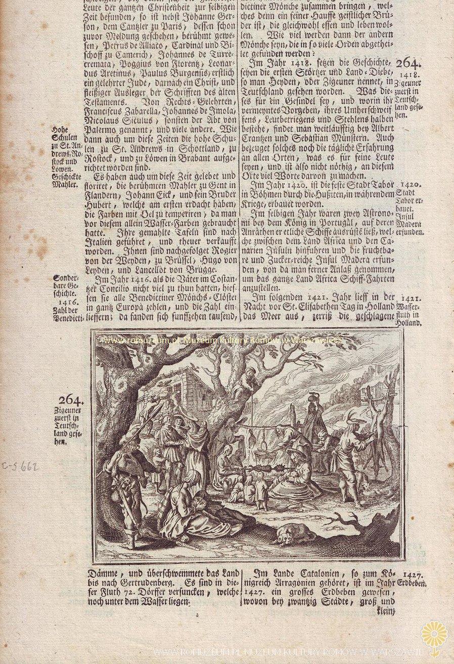 Zigeuner in Deutschland im Jahr 1418. Pojedyncza, dwustronnie zadrukowana w języku niemieckim karta z drzeworytem na papierze czerpanym. Karta pochodzi "Historische Chronica" Johanna Ludwig Gottfried (1584 - 1633), edycja Frankfurt 1674 r.