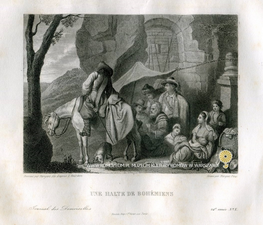 Postój Cyganów, Une halte de Bohémiens, grawerował Nargeot Fils & Pére według obrazu Sébastiena Bourdona (*2 II 1616 Montpellier - †8 V 1671 Paryż), w: „Journal des Demoiselles" nr 24, rok N°X, edit: Gilquin i Dupain, Paryż 1855
