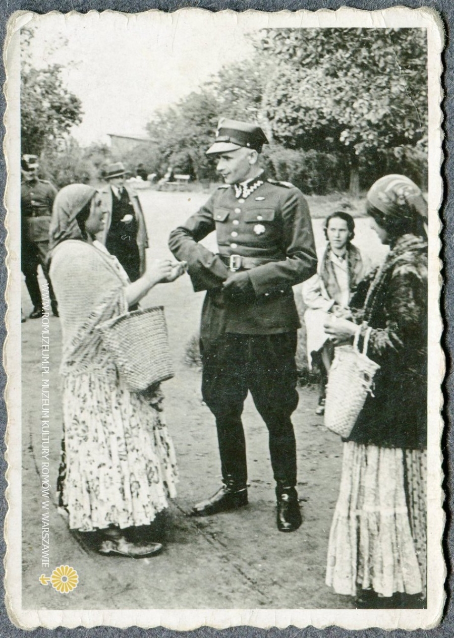 fd108 Wróżba dla Podoficera WP w mundurze wyjściowym, prawdopodobnie park w Zamościu, aut. pieczęć na rewersie: "Foto Leica Film J. Haus Zamość Staszica 5", fotografia na papierze, 5,5x4 cm, circa 1935