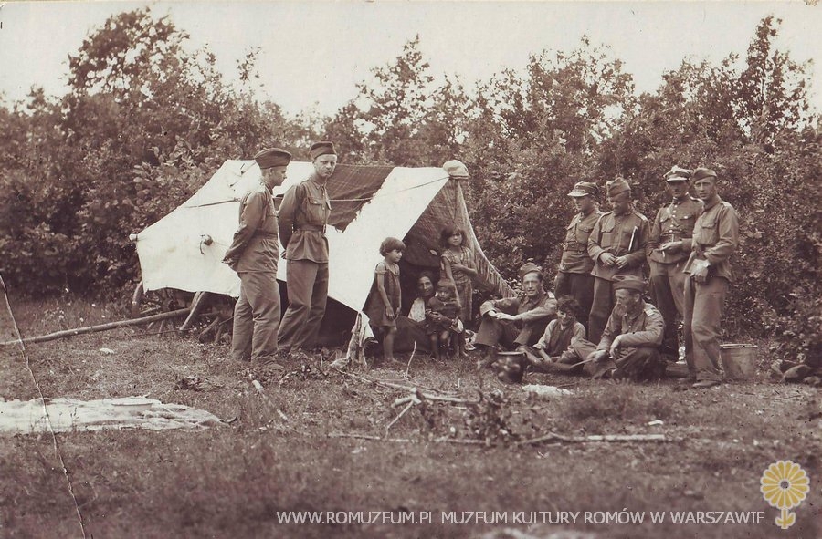 Na manewrach. Podchorążowie z Centrum Wyszkolenia Piechoty w Rembertowie w gościnie u rodziny z grupy Polska Roma. Autor zdjęcia i dokładne miejsce nieznane. Prawdopodobnie 1932 r.