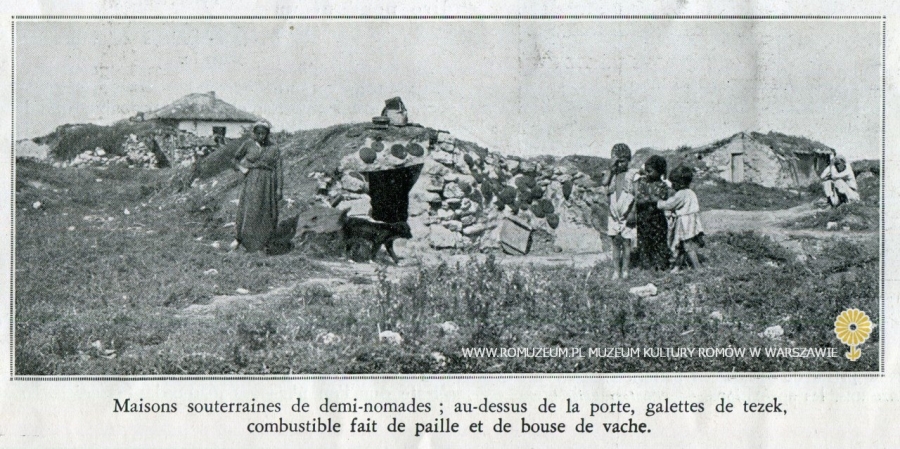 Les derniers nomades européens, Maisons souterraines de demi-nomades ; au-dessus de la porte, galettes de tezek, combustible fait de paille et de bouse de vache [Ostatni nomadzi Europy, ziemianki półkoczowników, nad wejściem suszą się placki na opał z krowiego łajna i słomy], fot. prof. Eugène Pittard w: L’illustration (dwie karty wyjęte z periodyku), Nr 4695, 25 II 1933