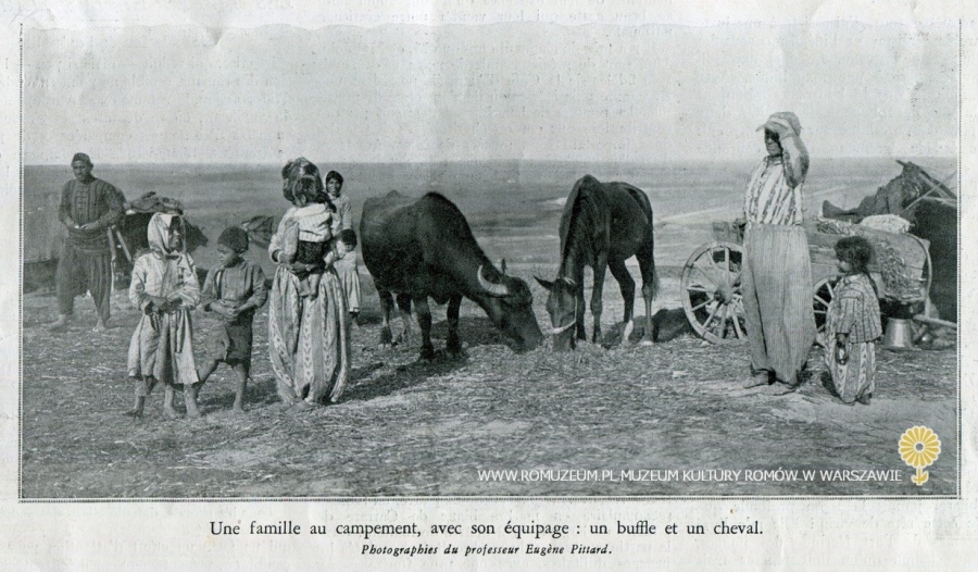 Les derniers nomades européens, Une famille au campement, avec son équipage : un buffle et un cheval [Ostatni nomadzi Europy, rodzina w obozie z wyposażeniem: bawołem i koniem], fot. prof. Eugène Pittard w: L’illustration (dwie karty wyjęte z periodyku), Nr 4695, 25 II 1933