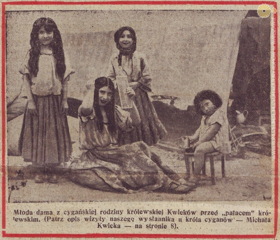 Młoda dama z cygańskiej rodziny królewskiej Kwieków przed „pałacem; królewskim”, Michał Kwiek-król Cyganów. rozmowa z władcą śniadego ludu; Ir-Ski. „Siedem groszy” Nr 113, wydanie DE, 26 IV 1934 r.