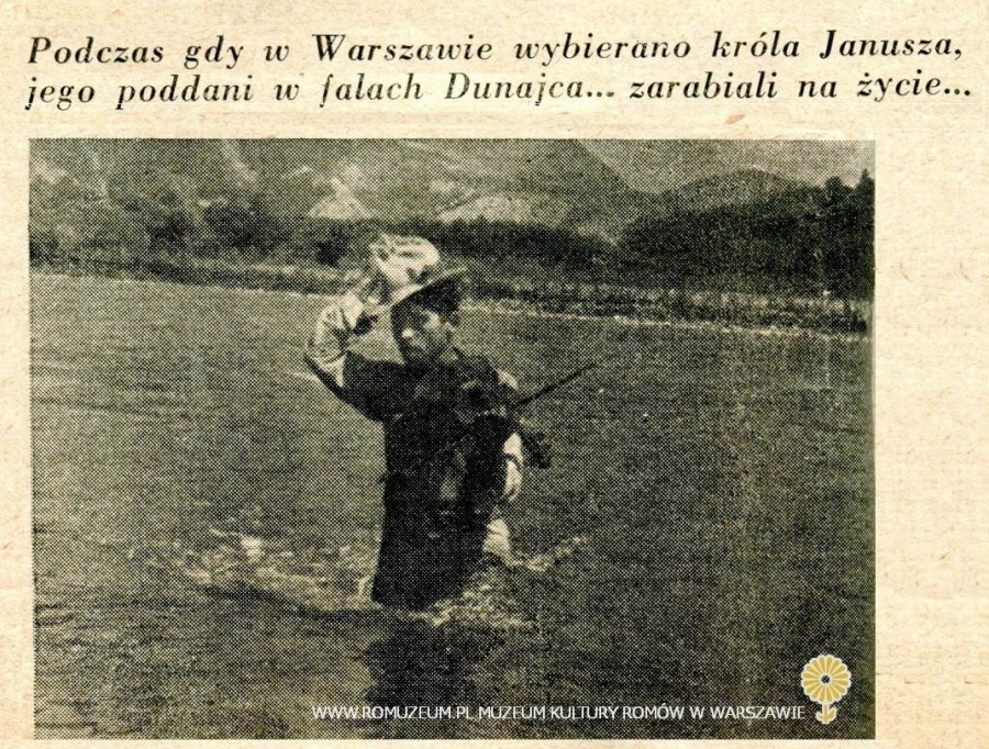 Podczas gdy w Warszawie wybierano króla Janusza, jego poddani w falach Dunajca... zarabiali na życie..., Jak było naprawdę na koronacji Janusza I-ego, króla cyganów, "Naokoło Świata" Nr 158, VIII 1937