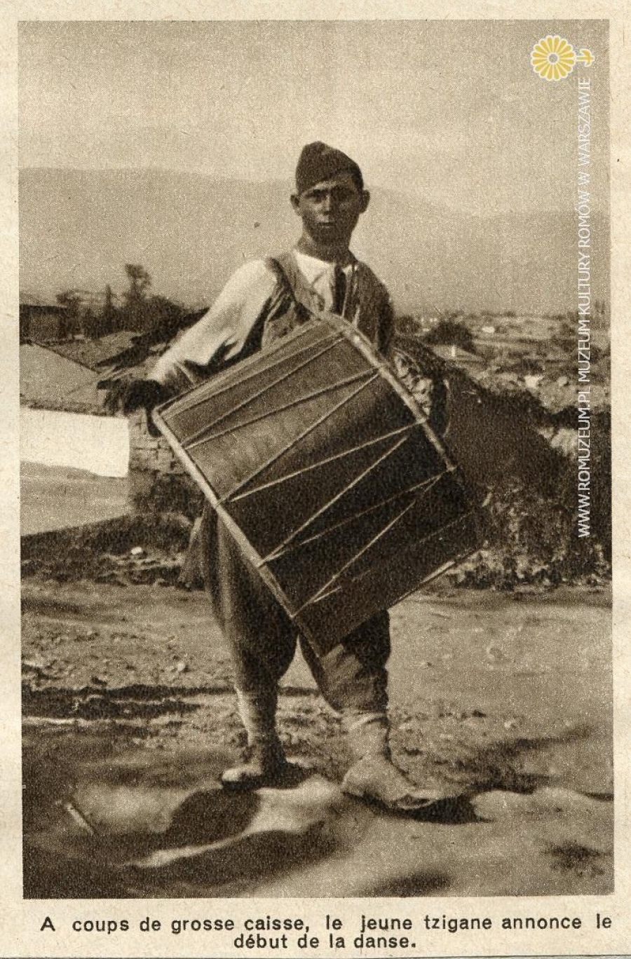 Cyganie. Biciem w wielki bęben, młody Cygan ogłasza początek tańca (Macedonia). Types de Tziganes - A coups de grosse caisse, le jeune tzigane annonce le debut de la dance. Pojedyncze zdjęcie z prasy w języku francuskim, fot. Delius, 1936