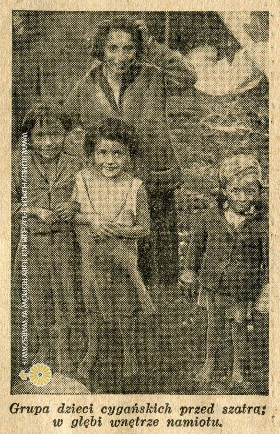 Grupa dzieci cygańskich przed szatrą; w głębi wnętrze namiotu, "Życie ciągle nowe" Zenon Koterba-Dziuban, fot. J. Niczyperowicz, "Kurier Literacko Naukowy" Nr 27, Dodatek do Nr 182. "Ilustrowanego Kuriera Codziennego", 4 VII 1938