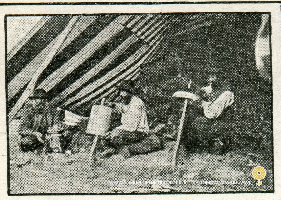 Gli a Zingari Roma. Una tribu do zingari della Polonia russa accampata nei pressi di Castel Sant` Angelo. Cyganie w Rzymie. Plemię cygańskie z rosyjskiej Polski obozowało w pobliżu Castel Sant`Angelo. Mężczyźni przy pracy, Karta z nieznanego włoskiego periodyku, circa 1905