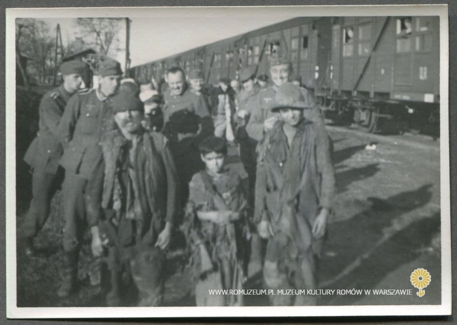 Kolejowy Transport Wojskowy, mężczyzna i chłopcy w otoczeniu żołnierzy, autor zdjęcia nieznany (żołnierz Wehrmachtu), fotografia na papierze, 4,2x5,9 cm, Rumunia, circa 1941