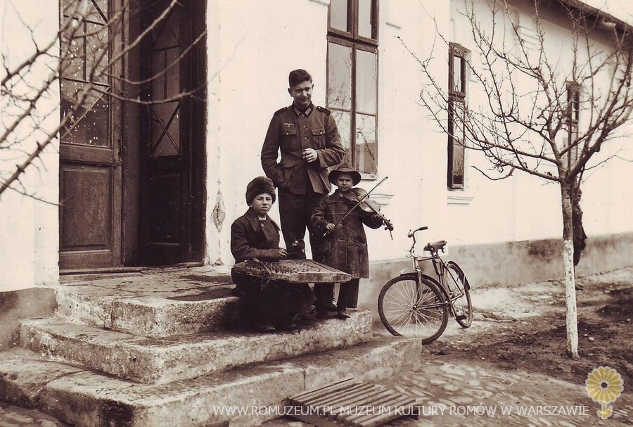 Wehrmacht Soldat u. Zigeuner Kinder Musiker mit Geige u. Zyllefon Rumänien 1941 [żołnierz Whr. i cygańskie dzieci grające na skrzypcach i cymbałach, Rumunia 1941]