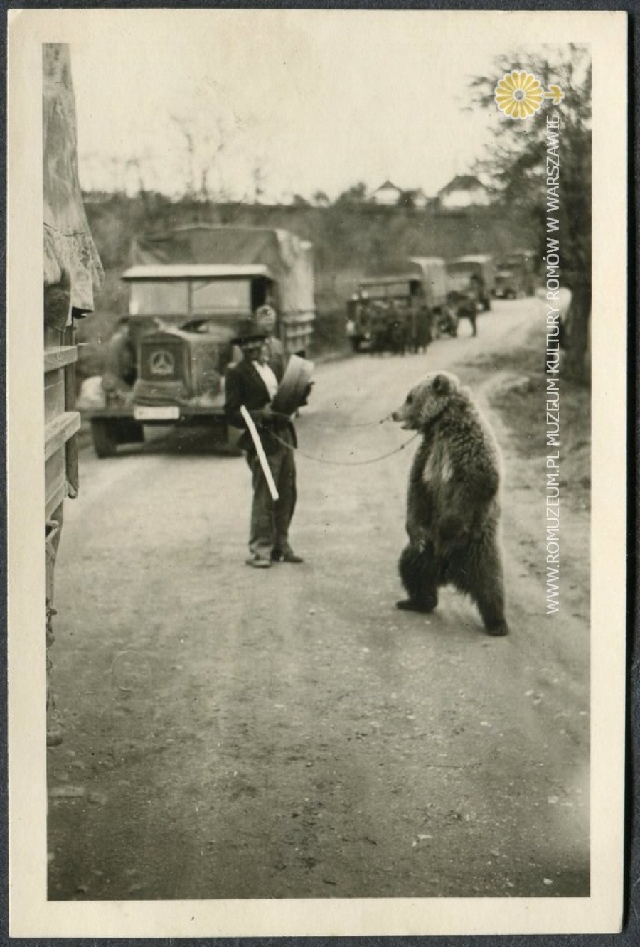 Niedźwiednik i kolumna samochodów ciężarowych Mercedes Benz LG3000 na przedmieściach Belgradu, autor zdjęcia nieznany (żołnierz Wehrmachtu), fotografia na papierze Agfa-Lupex 6x9 cm, odręczny opis na rewersie: , Vorort von Belgrad, Jugosławia, kwiecień-maj 1941