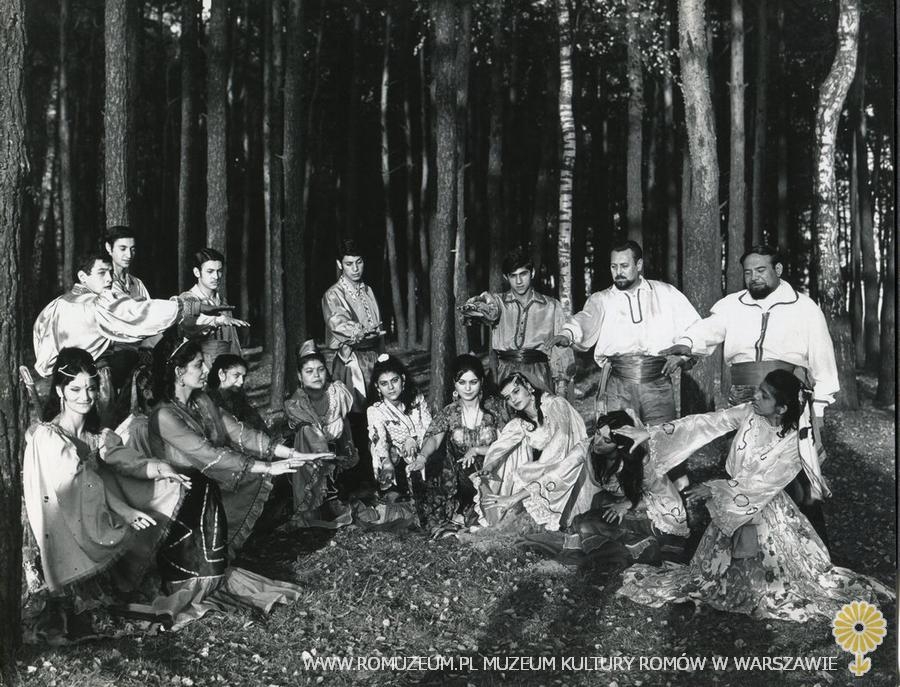 Zespół "Roma", fot. Andrzej Polakowski (pieczęć autora na rewersie fotografii), opis na rewersie: Artystyczny Zespół Cygański Pieśni i Tańca "Roma" w Krakowie, Kraków, ul. Os. Wiśniowa 2 m. 26, fotografia na papierze, zdjęcie wykonane w parku miejskim w Opolu podczas IX Krajowego Festiwalu Piosenki Polskiej w Opolu, czerwiec 1971