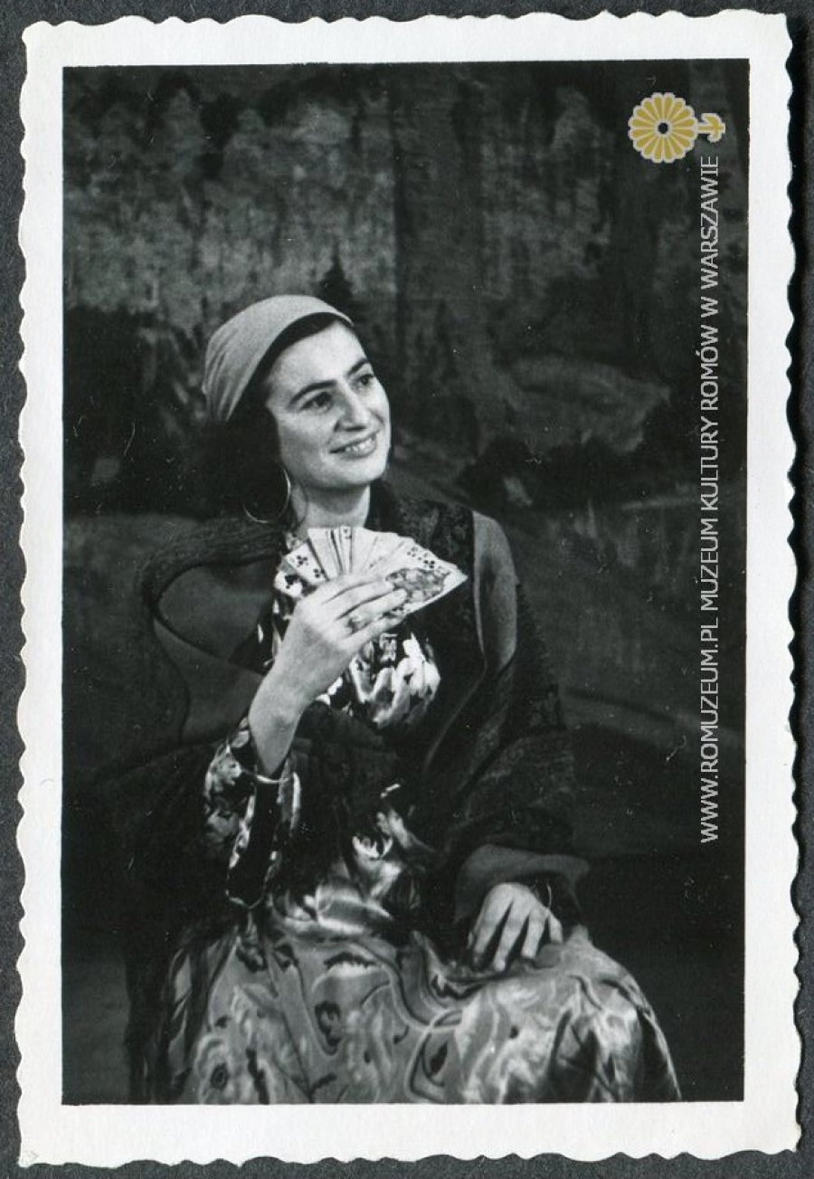 Wróżka (aktorka w kostiumie), fotografia na papierze, dokumentacja nieznanego spektaklu teatralnego (odręczny opis na rewersie sugeruje, że może to być "Czarodziejska Góra" Tomasza Manna), 6x8 cm, Polska circa 1970