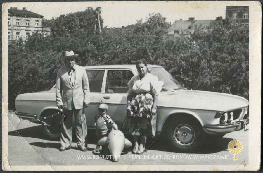 Archiwum rodzinne, rodzice z synem na tle samochodu marki BMW (prawdopodobnie Romowie z grupy Sinti), autor nieznany, fotografia na papierze, Polska-Śląsk, circa 1970