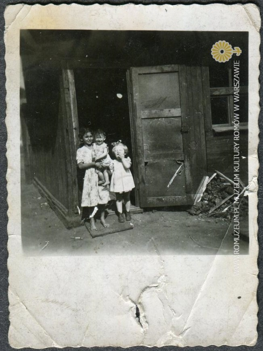 Archiwum rodzinne, dzieci przed wejściem do domu (prawdopodobnie Romowie z grupy Sinti), autor nieznany, fotografia na papierze, Polska-Śląsk, circa 1955