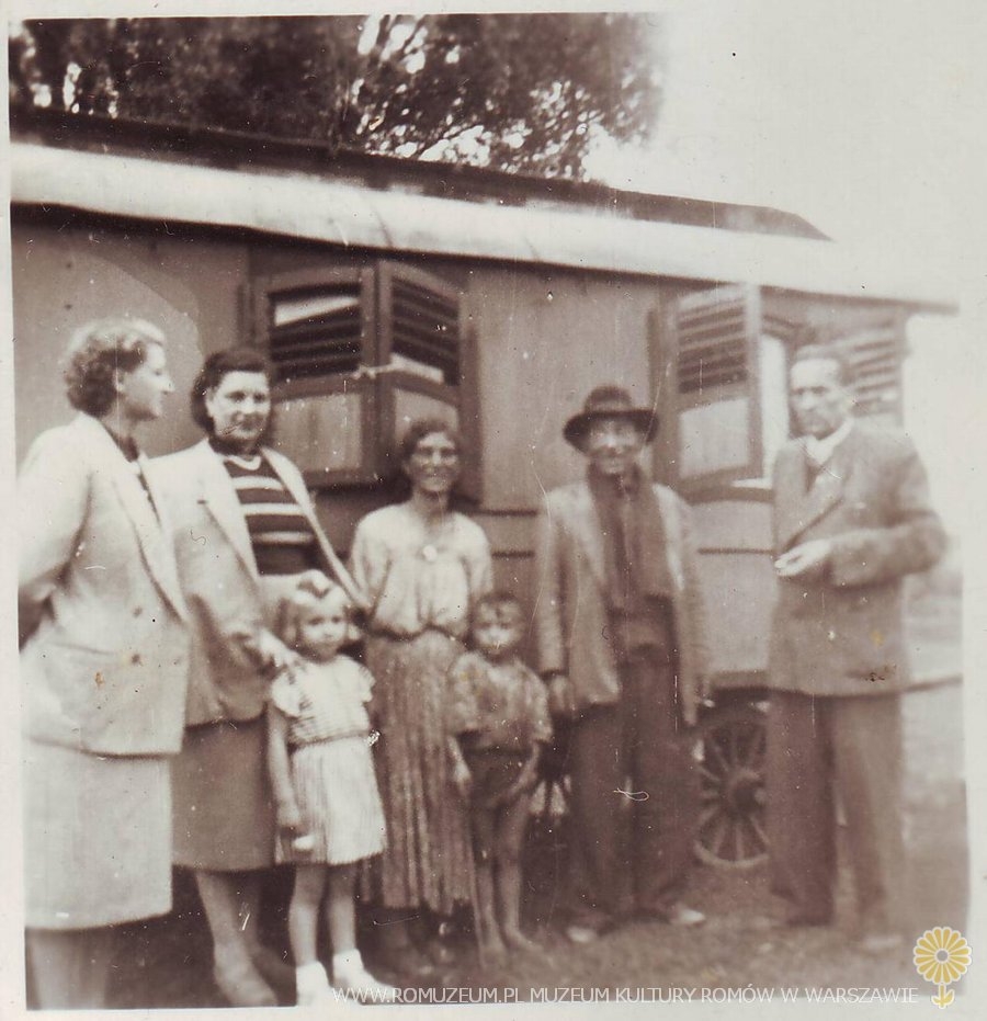 Rodzina romska w otoczeniu nie-Romów. Wóz typu niemieckiego. Zdjęcie nieznanego autora, circa 1950 r.
