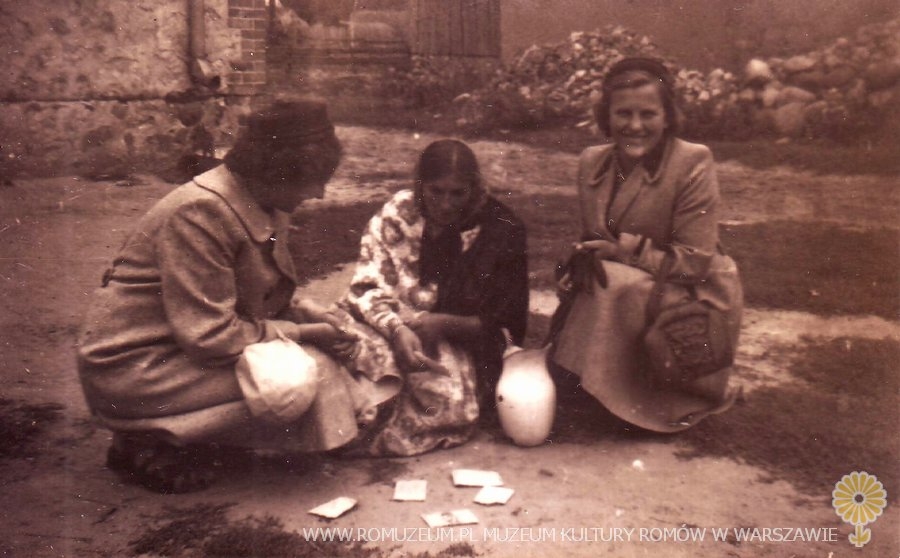 Cyganka (prawdopodobnie Polska Roma) z kurą i dzbankiem na mleko podczas wróżby. Autor zdjęcia i miejsce nieznane, circa 1950
