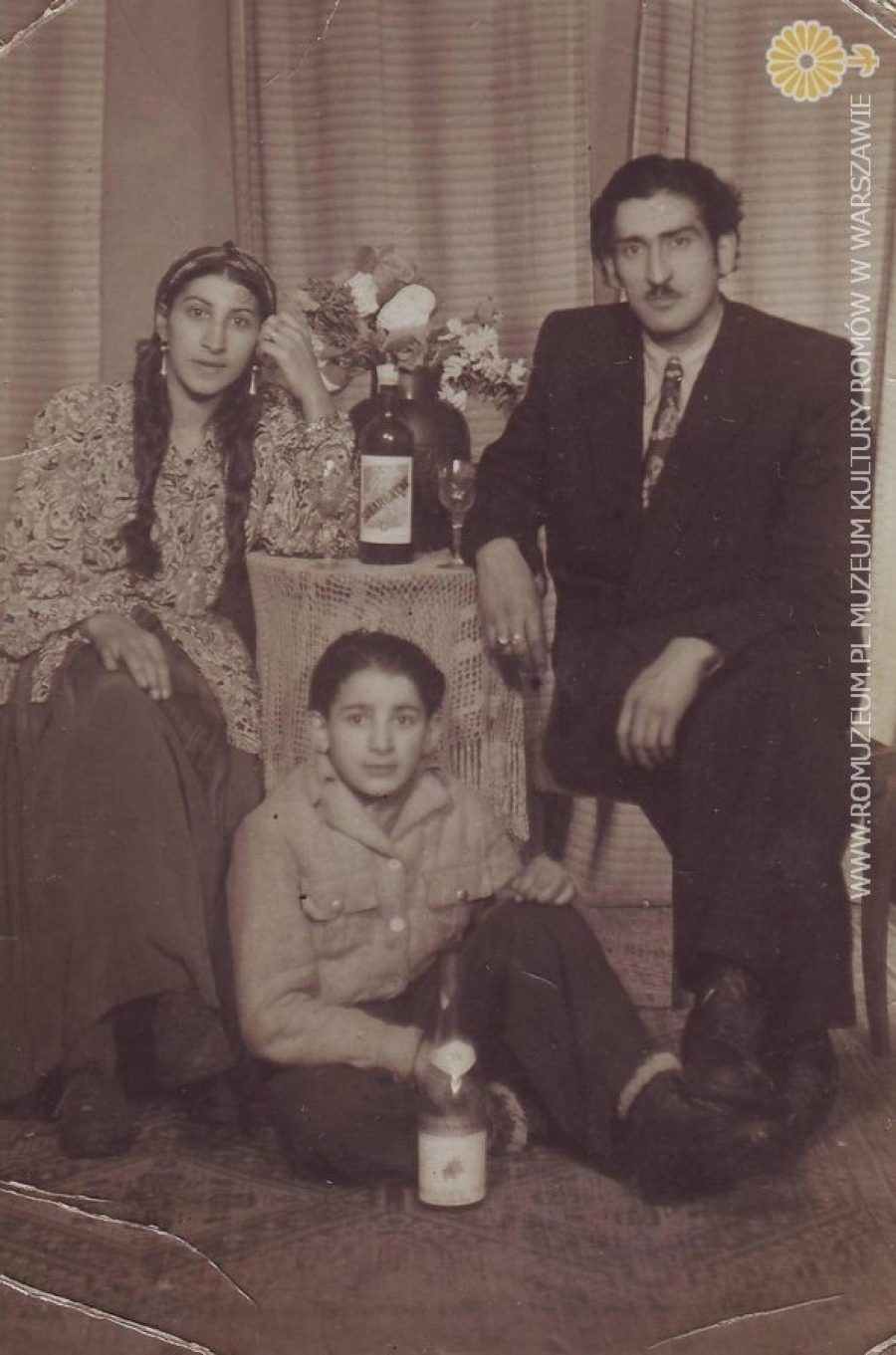 Rodzice z synem (prawdopodobnie tzw. Austriacy, Lowarzy lub Kełderasze). Zdjęcie z atelier. Wino w centrum zdjęcia nazywa się "Szkarlatyna" (sic!). Autor zdjęcia i miejsce nieznane, circa 1950 r.