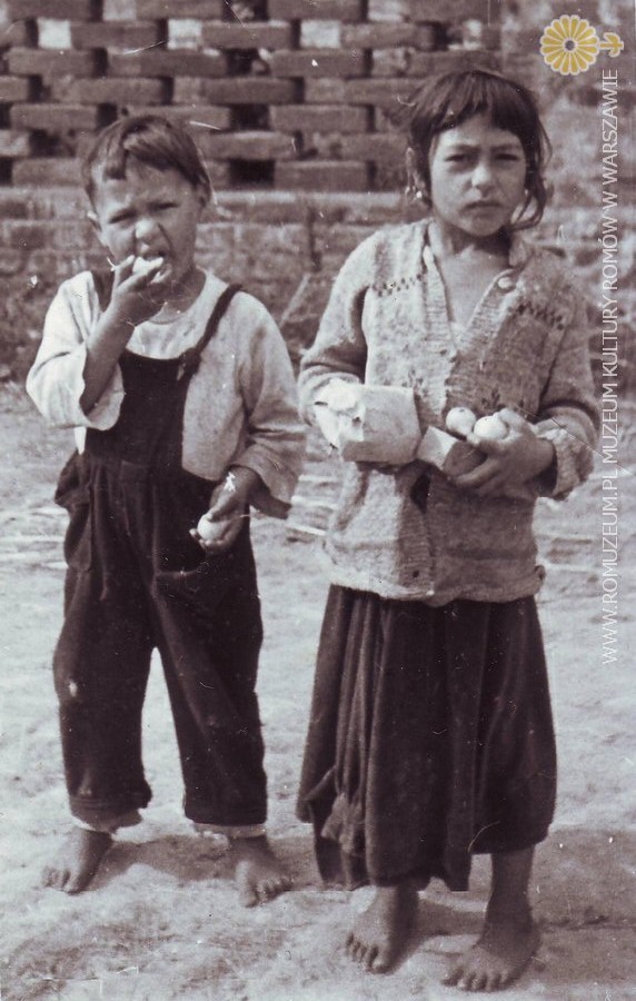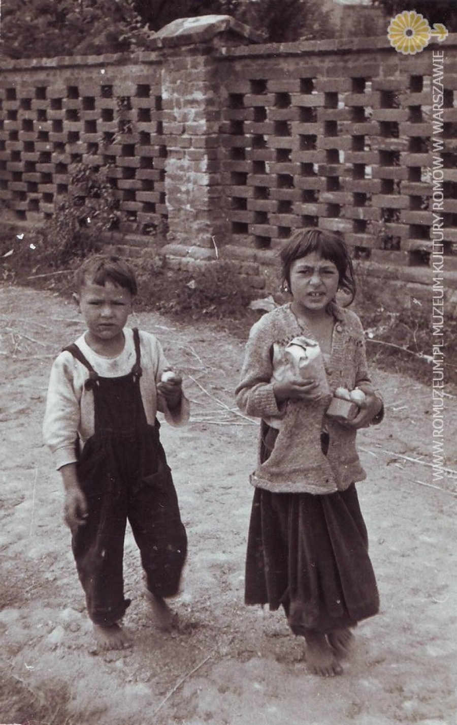 Rodzeństwo (prawdopodobnie Polska Roma) ze sprawunkami. Autor zdjęcia nieznane, okolice Chrzanowa circa 1950 r.