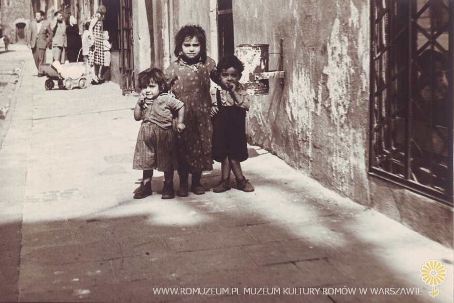 Rodzeństwo (Romowie Karpaccy) na ulicy. Zdjęcie pochodzi z albumu z detalami architektonicznymi, zdjęcia wykonał student architektury (nazwisko nieznane) w Bystrzycy Kłodzkiej w 1951 r.