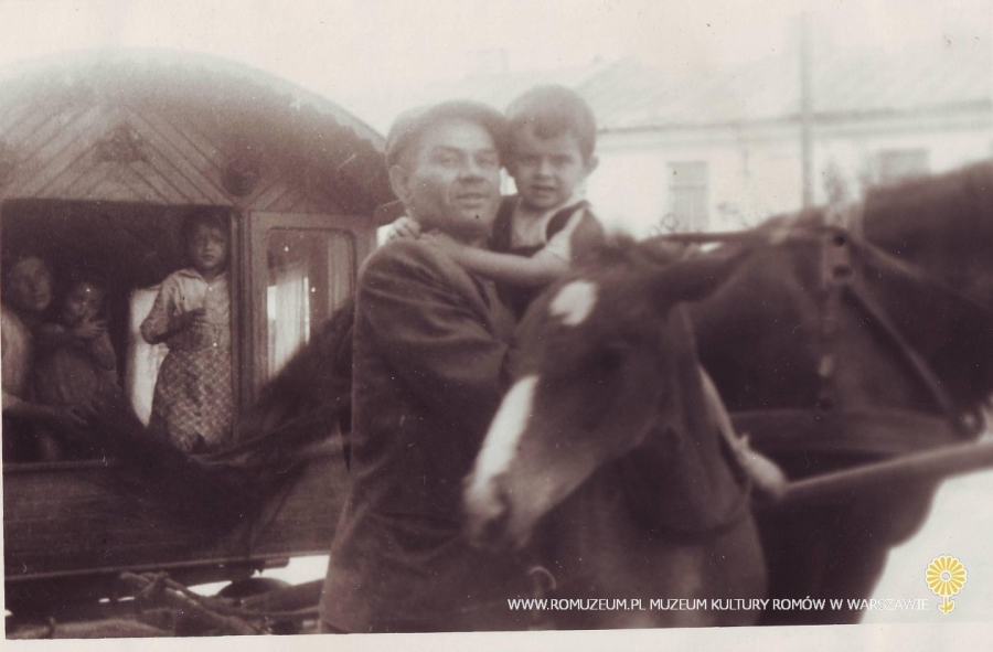 I pojechać z Cyganami... Mieszkańcy wsi/miasteczka (nie-Romowie) pozują w wozie (prawdopodobnie należącym do Romów z grupy Polska Roma) typu ostrowskiego, autor zdjęcia nieznany, circa 1960