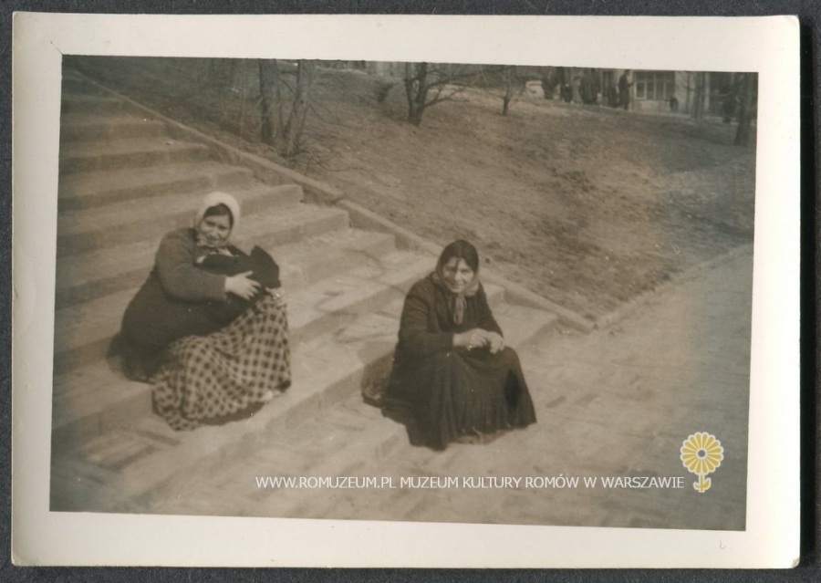 Dwie młode kobiety (Polska Roma) na schodach Rynku w Ostrowcu Świętokrzyskim, na rewersie stempel pwd. Julian Ziaja, fotografia na papierze, 6,5x9,5 cm, Ostrowiec Św., 1965