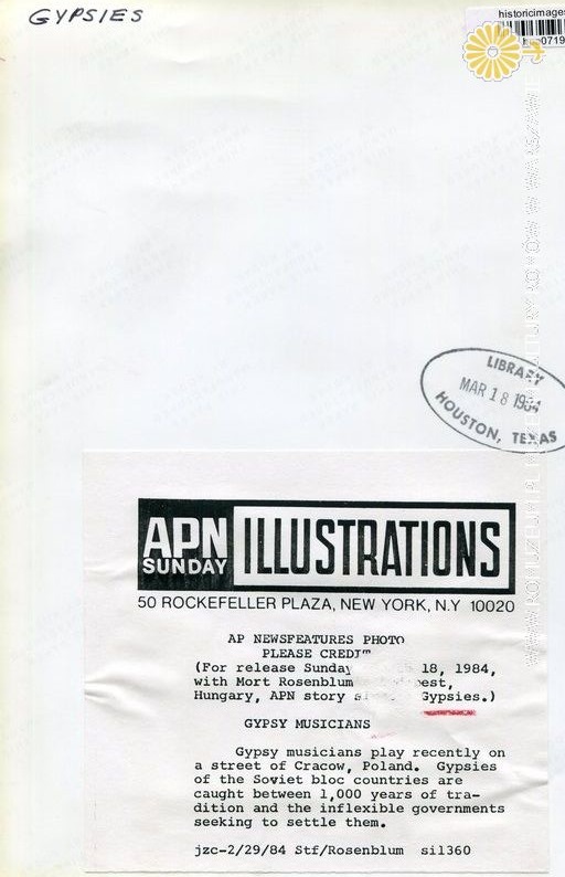 Kororo Stefan Dymiter. Gypsy musicians play on street of Cracow, Poland, fotografia agencyjna, aut. Mort Rosenblum dla "APN Illustrations", owalna pieczęć: Library Mar 18 1984 Houston, Texas, fotografia na papierze, 27x20 cm, 1984