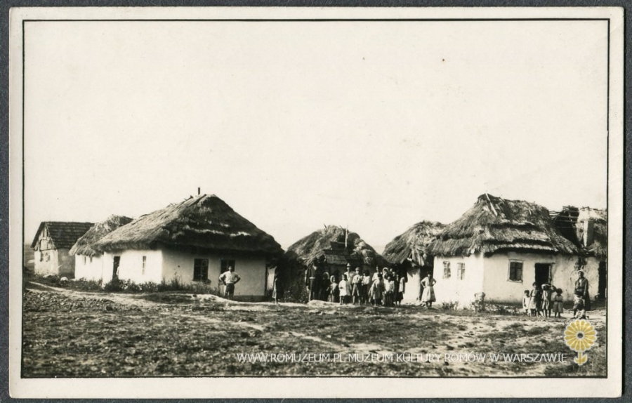 Mieszkańcy osiedla przed domami, osiedle romskie na Zakarpaciu, wydawca nieznany, Czechosłowacja, bez obiegu circa 1930