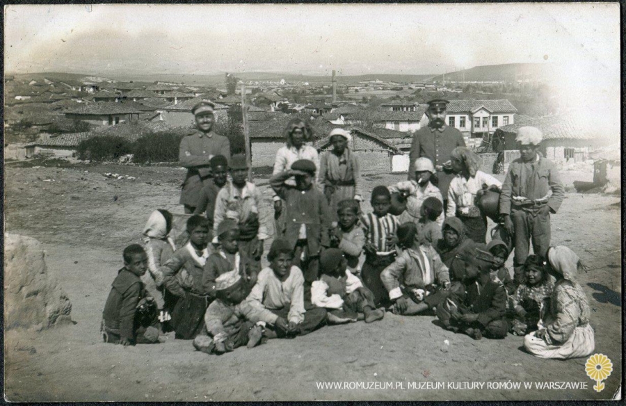 Dzieci z żołnierzami Armii Cesarstwa Niemieckiego na tle osiedla (prawdopodobnie Macedonia), wyd. nieznany, bez obiegu, circa 1917
