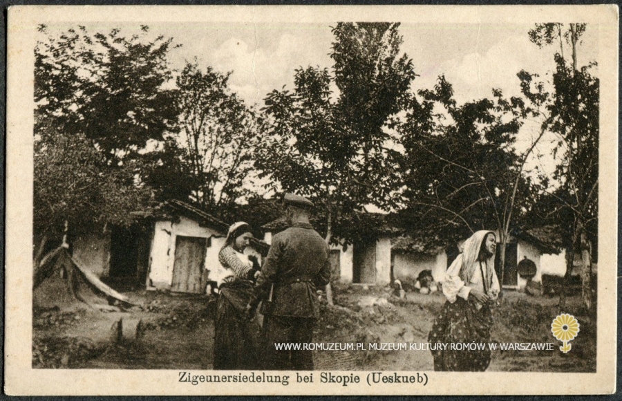 Macedonien, Zigeunersiedelung bei Skopie (Ueskueb/Macedonia) [osada romska w pobliżu Skopie], żołnierze Armii Cesarstwa Niemieckiego, Bahnhof und FeldbuchhandelGesellschaft m.b.H. Berlin S14. Gesetzl.gesch. Nr 70, bez obiegu, circa 1915