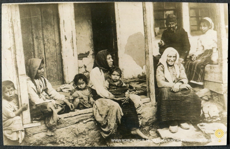 Grupa Romów na progu domostwa, na rewersie odręczny opis: Zigeuner in Briefe, prawdopodobnie Macedonia lub Serbia, wyd. nieznane, bez obiegu, ręcznie datowane 13 X 1917
