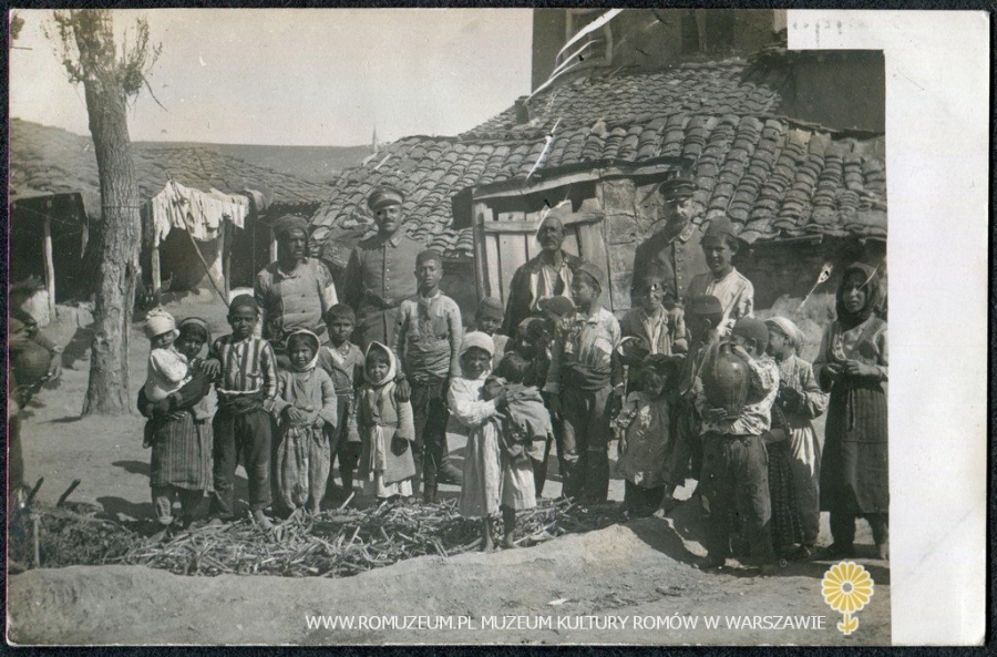 Żołnierze Armii Cesarstwa Niemieckiego z dziećmi na tle osiedla (prawdopodobnie Macedonia/Serbia), wyd. nieznany, bez obiegu, circa 1917