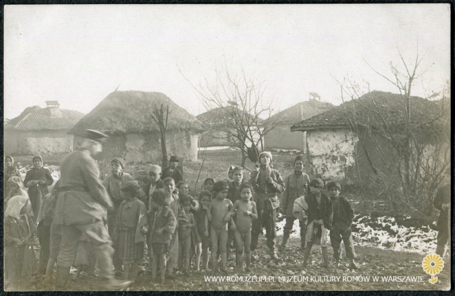 Dzieci z żołnierzami Armii Cesarstwa Niemieckiego na tle osiedla, na rewersie odręczny opis: Serbische Zigeuner im Winter [serbscy Romowie zimą], wyd. nieznany, bez obiegu, circa 1917